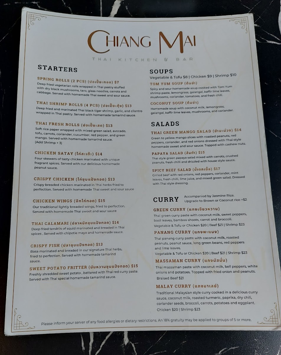 The menu at Chiang Mai is a delightful exploration of Thai cuisine, with an emphasis on fresh ingredients and authentic flavors. Start your meal with the Thai Shrimp Rolls, a crispy delight featuring marinated black tiger shrimp, bursting with flavor and perfectly complemented by a homemade tamarind sauce. For a vegetarian option, the Spring Rolls are a crowd favorite, filled with an appetizing medley of black mushrooms, glass noodles, and vibrant vegetables, all served with their signature sweet chili sauce.